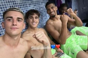 开心!加维社媒晒与阿劳霍、库巴西更衣室合照,庆祝球队取胜