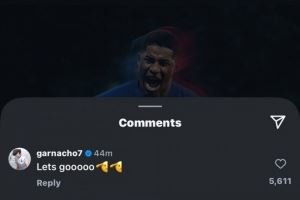加纳乔在拉什福德官宣社媒下留言道:“Let’s go!(直译为“让我们出发”,也可理解为“冲啊!加油!”)”并配上了“敬礼”表情。