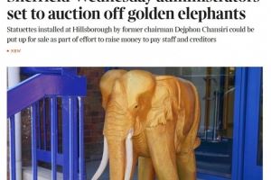 体育资讯10月28日讯 据《泰晤士报》报道,进入托管状态的谢周三俱乐部正采取多种措施筹集资金,托管人准备拍卖掉前主席钱西里安放在希尔斯堡球场的两尊标志性金象雕像。这些雕像因担心被球迷破坏或盗窃已被移至室内。